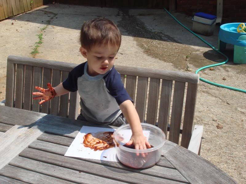 Tye and I have both been really busy with work these days so I have decided to "make" some one on one Landon time with no distractions. I decided to go back to my preschool teaching days and remembered pudding painting. Lan was a little unsure at first about putting his hands in a bowl full of yucky stuff but then discovered it could be a blast. We have been also having a lot of ice cream nights and I will include a few pics from that as well. We also had a visit from Uncle Wes and cousin Nyima. Nyima was very good with Lan other than she didn't want him to ruin her tent she made last night. I haven't uploaded the pics but when I do I will post.