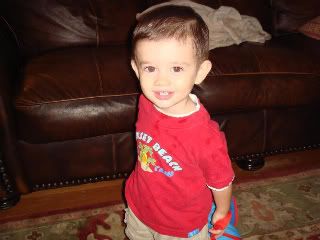 Landon started Paren't Morning Out on September 2nd. His teachers are wonderful. They are caring and loving yet have reasonable expectations for a one and a half year old. I think it is a great balance. While we were out to dinner for Tye's birthday Landon had an incident. He was in his booster seat on a chair and kicked himself back and landed on the concrete patio with his head. His first trip to the ER. Thankfully the Dr. at the Children's Hospital deemed it a mild head injury. He scared us bad with that and convinced us that unless where we are eating has high chairs we will not be going there. At school on Thursday he got to stamp paper and according to his teacher he loved it! Then Saturday rolled around and he woke up with a fever. He stayed sick and with a fever until Thursday and is finally better! I am hoping for a healthier rest of the year at this point! Here is a pic of Lan before his first day of PMO.