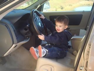 I was not exposed to boys very much at all before having Landon. I have all sisters and one step brother, so the thought of a boy scared me a bit. I wasn't sure there would be any huge differences in the early years, but I was wrong. Landon is ALL boy. Cars, trains, danger, balls, golf clubs used as weapons is the norm in our house these days. It seems the more dangerous an item looks the more Landon wants to play with it. We went to the farm today which now that we are back I am not sure it was a great idea since he is recovering from croup. All he wanted to do was sit in Grandaddy's car and "drive" it. If he was not playing in the car he wanted to try to pick up logs from a cut up tree that were bigger than he is. I decided since he was so into pretend driving that Lan and I would take a drive in my SUV through the fields to visit the cows. I let him sit in my lap and steer us through the pasture. I am sure it was a site to see from far away. We got out and moo'ed at the cows until I think we upset a bull because he came to close for comfort, a few feet in front of us. I am normally not worried but I wasn't sure how I would wave him off while holding a 19 month old in my arms so we retreated back to the safety of the car. Tye was working on fixing a tire on our new but old riding lawn mower. Hearing my dad and Tye talk about it you would think it was the super stars of riding lawn mowers but check out the video and get a good chuckle on what it really looks like. The men got the idea to let Landon steer it around and he was thrilled to drive around on Grandaddy's lap for 30 minutes and screamed "more, more" when it was time to get off. I thought I might one day be able to live in this small town surrounded by nothing but land and a dairy farm but I was reminded today that I am a city girl and should stay put!