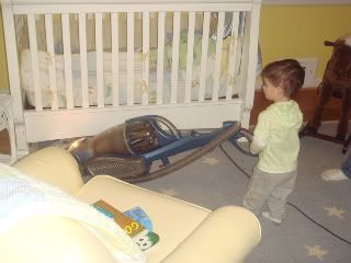 to start teaching a willing 19 month old to vacuum. Landon LOVES vacuum cleaners. He has been crazy about them since he could crawl at 6 months old. As we were cleaning the house last night now that Landon is finally starting to feel better again Tye pulled out the vacuum and Lan was instantly excited. When I came back from the bedroom into the living room Tye was letting Lan vacuum the living room. The kid was having a blast! I grabbed the camera and started snapping away and took a few short videos. The front end of the vacuum was not touching the floor the entire time but what does that matter, I just hope he enjoys this as much when he is 7 or 8 years old! Who am I kidding by that age it will feel like punishment, but I will take what I can get right now in this moment.